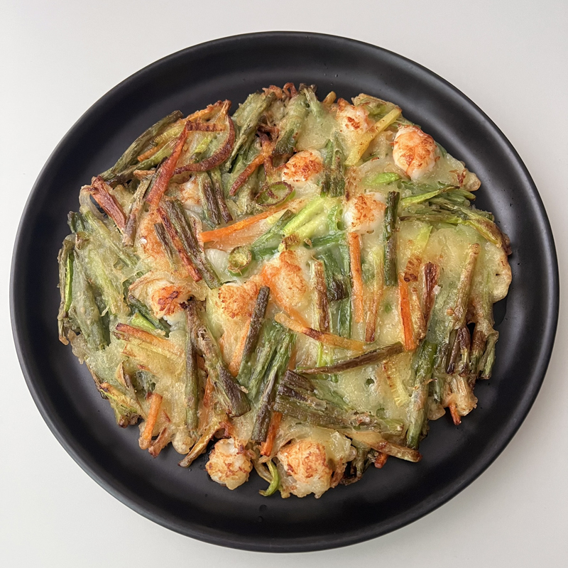 반대쪽도 노릇노릇하게 익히면 바삭하고 맛있는 새우 해물파전 완성입니다.