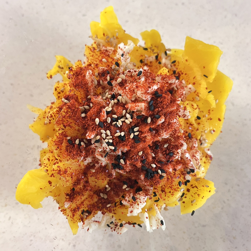 양념이 단무지에 잘 스며들도록 조물조물 무쳐주면 새콤달콤하고 고소한 치자 단무지 무침 완성이에요!