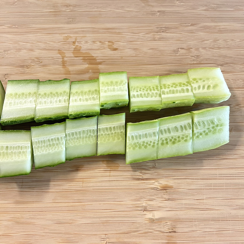 깨끗이 씻은 오이는 길게 반으로 자른 뒤, 약 3cm 길이로 깍둑 썰어주세요.