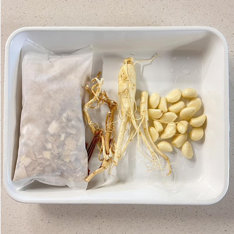 여기에 한약재와 수삼, 마늘, 생강, 대추, 밤 등 취향에 따라 재료를 추가하면 국물이 더 진하고 깊은 맛을 내는 맛있는 삼계탕이 완성돼요.