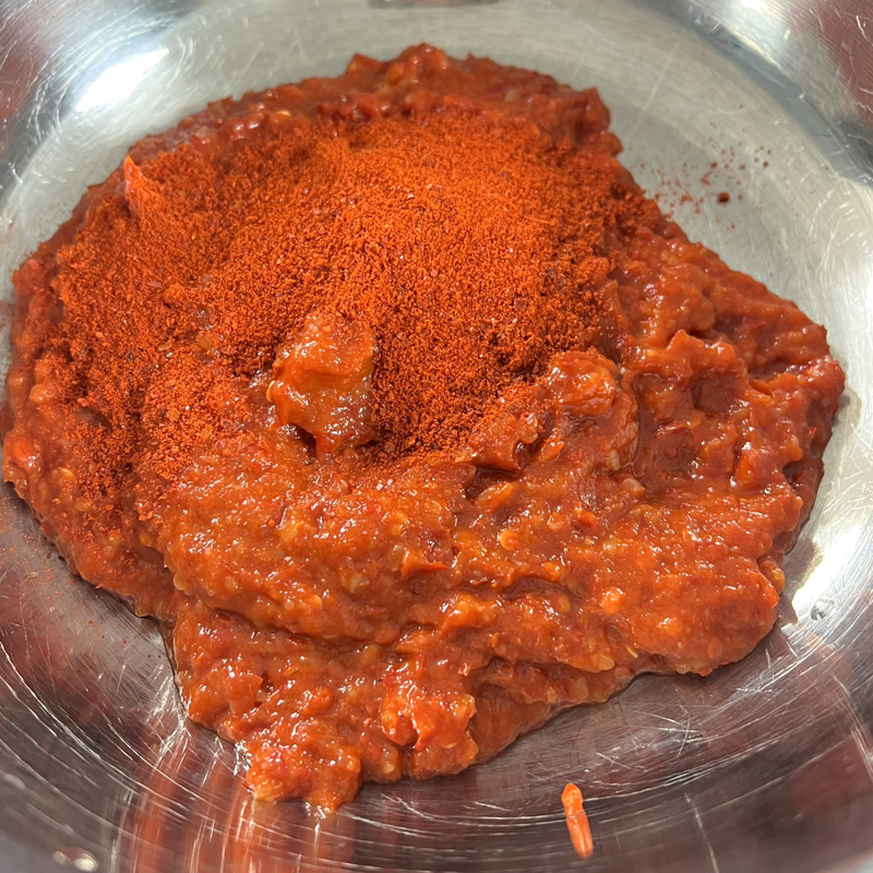 볼에 믹서기에 간 양념을 큰 볼에 담고 고춧가루 3숟갈 가득 넣어 골고루 섞어주세요.