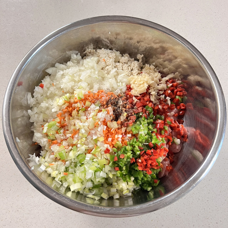 돼지고기와 두부가 만나 부드럽고 촉촉하며 야채를 넣어 다양한 맛이 느껴져요.