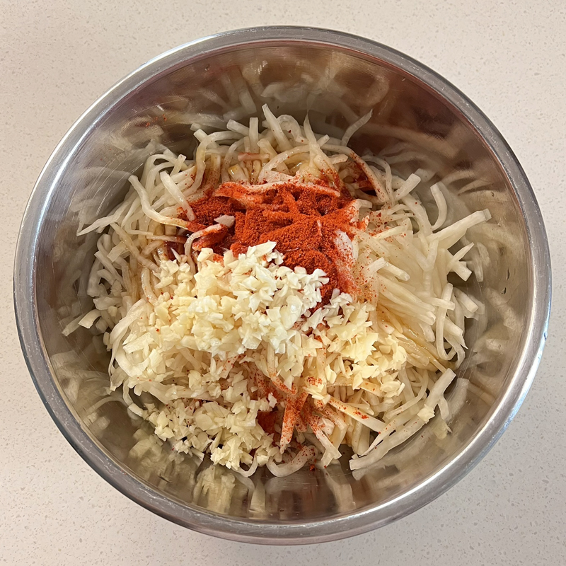 물기를 뺀 무에 아래 양념을 넣고 골고루 섞어주세요.