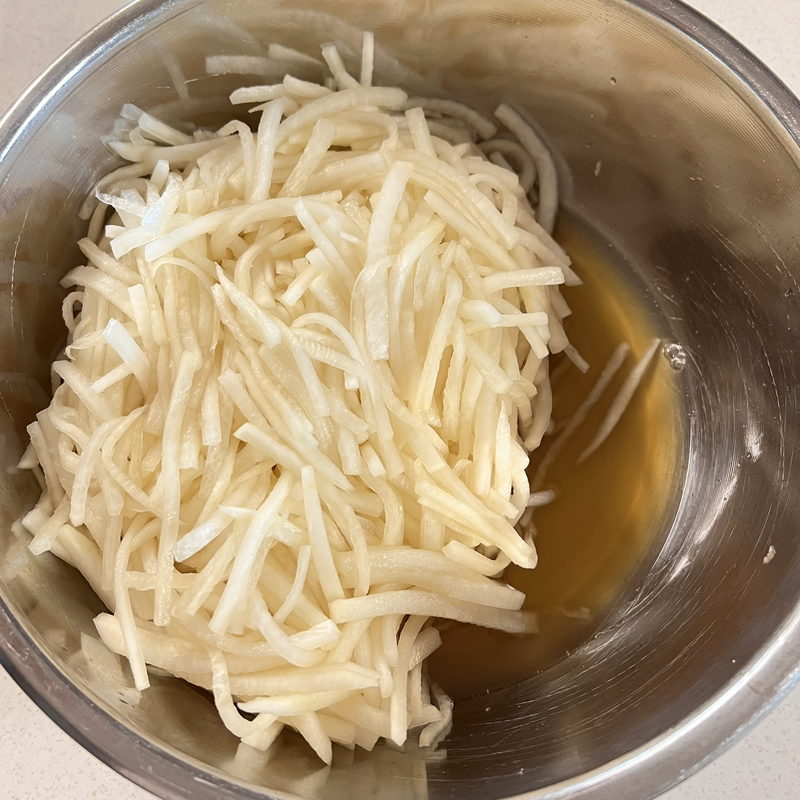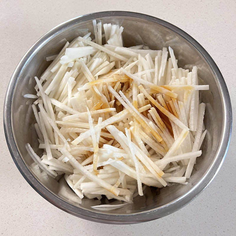 깨끗하게 씻은 무는 채 썰어 큰 볼에 담고 아래 재료를 넣어 약 10분간 절여주세요.